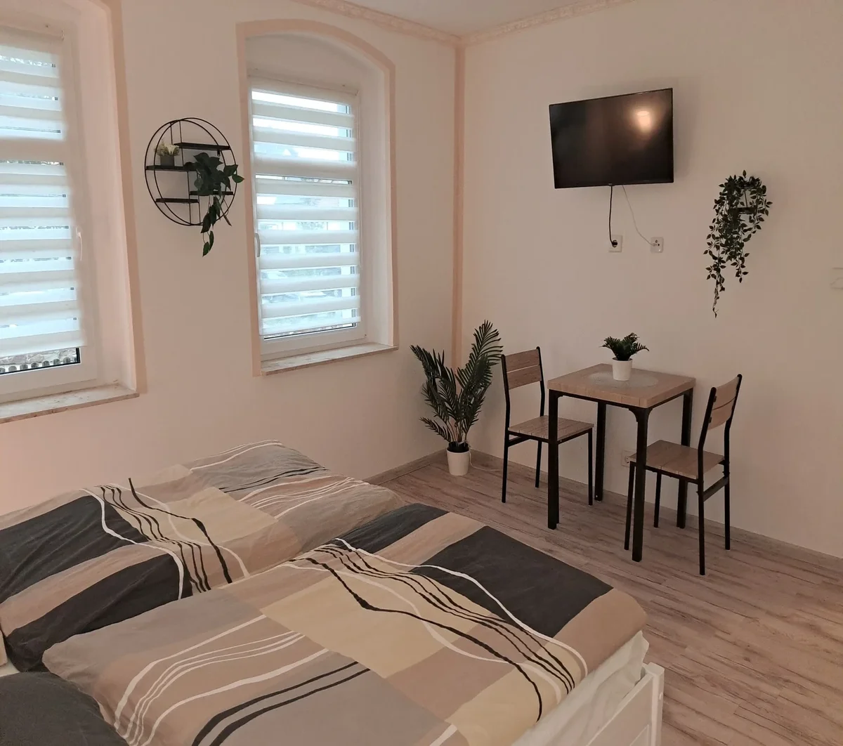In diesem Zimmer befindet sich ein Tisch mit 2 Stühlen, ein TV und ein Kleiderschrank.